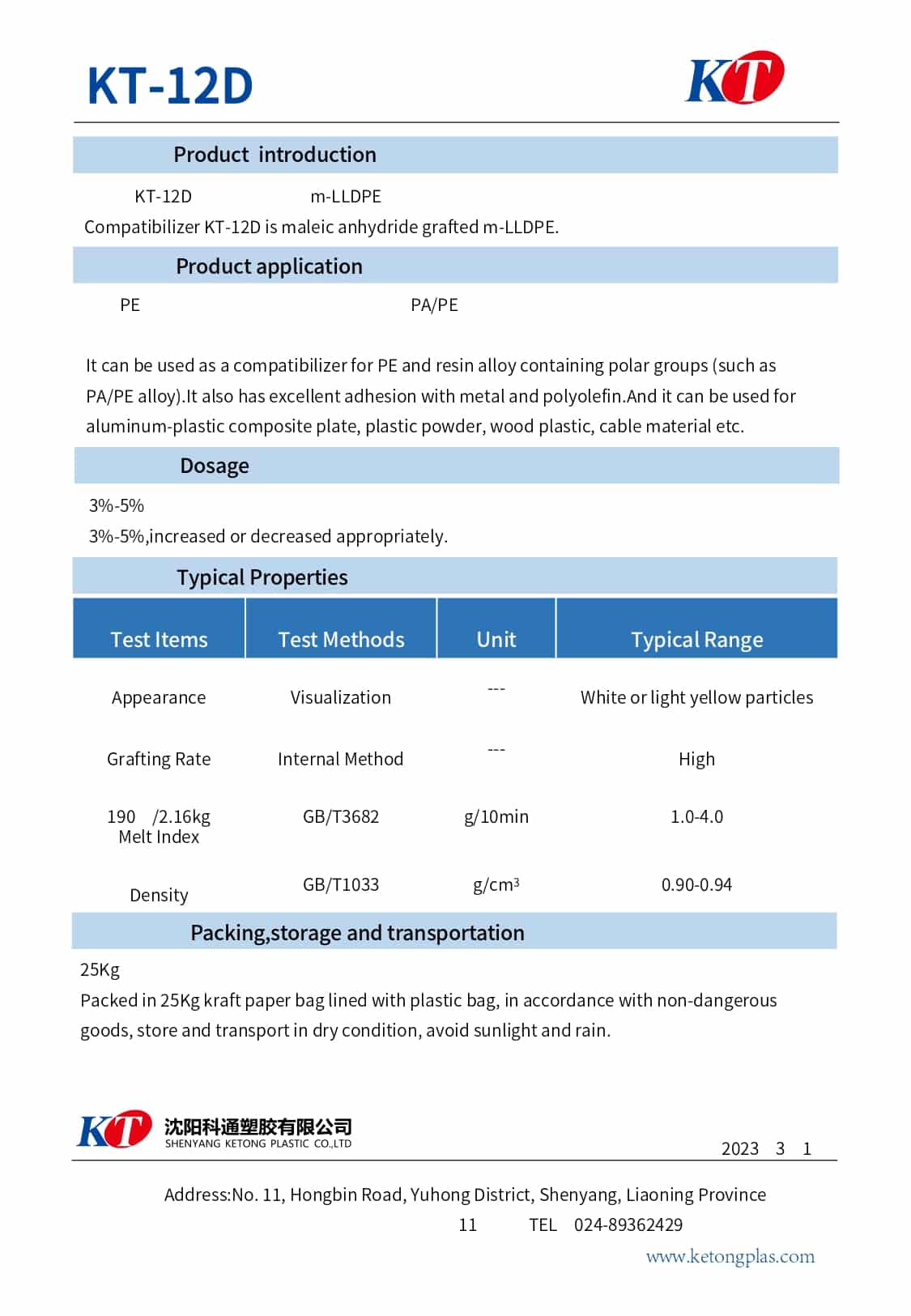 - Compatibilizer KT-12D: Bridging Polymers and MetalsIntroducing Compatibilizer KT-12D, our innovative maleic anhydride grafted m-LLDPE (metallocene Linear Low-Density Polyethylene) product. KT-12D is engineered to act as a powerful compatibilizer in diverse industrial applications, particularly in bridging polyethylene (PE) with polar group-containing resins like PA/PE compounds.