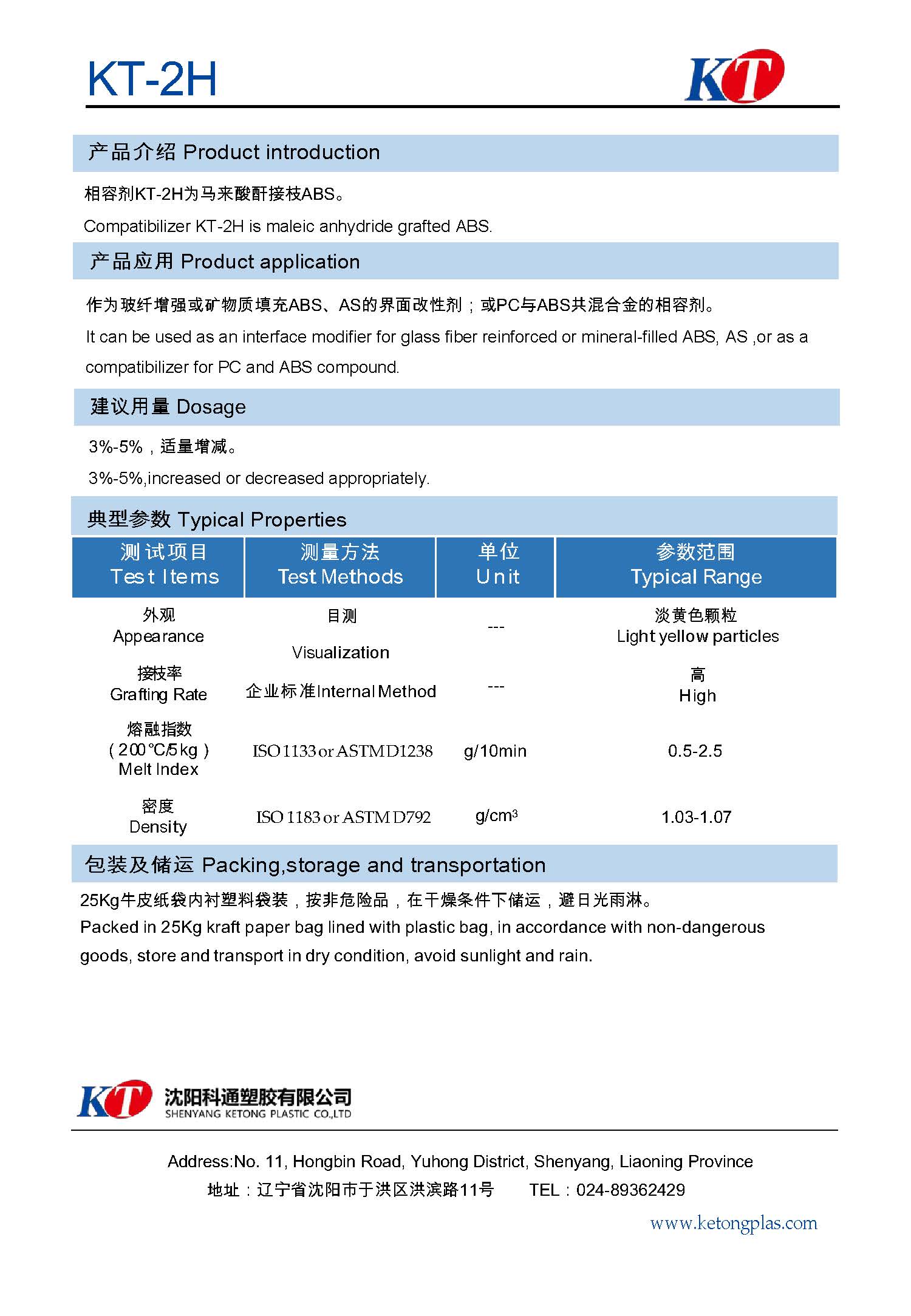 - KT-2H: Heightening Polymer Composites with Advanced TechnologyDiscover KT-2H, our specialized Maleic Anhydride Grafted Acrylonitrile Butadiene Styrene (ABS), a game-changer in the field of polymer composites. This innovative material serves as a highly effective interfacial modifier and compatibilizer.Key Applications of KT-2H:Interfacial Modifier for ABS and AS: Perfectly suited for acrylonitrile styrene copolymer (AS) and ABS, enhancing their ability to bond with fibers and minerals. This leads to composites with improved structural integrity and performance.